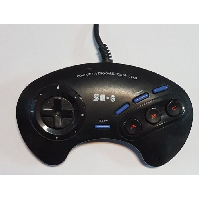 Een Control Pad voor de Sega Genesis / Mega Drive. Deze SG-8 Control Pad heeft 6 knoppen, een D-Pad en een turbo functie.