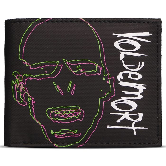 Gewaxte bifold portemonnee met Voldemort neon zeefdruk en verhoogde tekst puff print op de buitenkant. Binnenkant met debossing en zeefdruk, die 3 snel toegankelijke kaartvakken heeft, een apart vak voor je muntgeld en ook voor je grote biljetten.