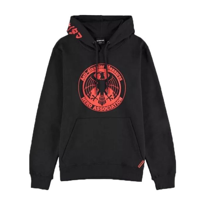 Stoere hoodie in One Punch Man thema van Difuzed! Deze zwarte hoodie bevat een opdruk van het Hero Association embleem met de tekst "Anti-disaster Measures - Hero Association"!
