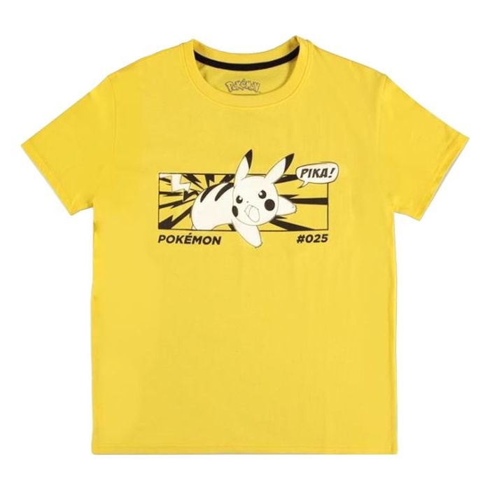 Laat je sportieve look zien wanneer je dit gele katoenen Pikachu T-shirt met zeefdruk op de voorkant draagt. Zwarte contrasterende taping in de nek.