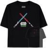 Combineer je favoriete hoge taille jeans met deze coole en trendy Star Wars geïnspireerde zwarte katoenen crop top. De opvallende graphic op de voorkant heeft twee zacht aanvoelende gezeefdrukte lichtzwaarden en een hoge dichtheid print van het Star Wars logo eronder. Ook op de achterkant is een opvallende Japanse tekst gezeefdrukt.