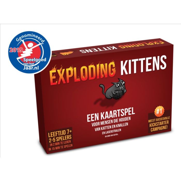 <div><b><span style="font-size:18px;">Exploding Kittens A Card Game: Nederlands</span></b></div><div><hr id="null"></div><div>Geheel Nederlandstalige uitgave van het te gekke kaartspel Exploding Kittens, dat een combinatie is van Russisch Roulette en schaken. Doel van het spel is net zo lang te overleven totdat je de laatste speler bent. Eigenlijk is het spel heel simpel: wanneer je aan de beurt bent, speel je je "actiekaarten" zoals Ontmantel en Voorspel de Toekomst om de Exploding Kittens te ontlopen. De ene kaart gebruik je om een tegenstander te vloeren, een andere gebruik je om een aanval af te weren. En als je de juiste combo speelt, kun je een aanval uitvoeren die het aantal spelers met een doet afnemen: KABOEM! Exploding Kittens is bekend van de meest succesvolle Kickstarter campagne en zorgt gegarandeerd voor veel hilariteit!</div>