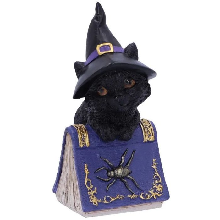 Dit charmante kattenbeeldje is gegoten in hoogwaardige hars voordat het zorgvuldig met de hand is geverfd. Pocus voelt zich speels terwijl hij rechtop staat, naast een paars spreukenboek. Met een zwarte heksenhoed op haar hoofd en een grote verzilverde spin die de grimoire versiert, is dit stuk het perfecte cadeau voor de charmante heks in je leven.