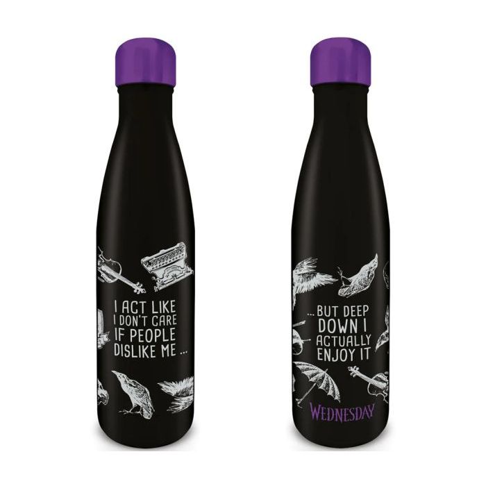 Leuke waterfles van Pyramid Interntional in Wednesday thema! De waterfles bevat emblemen en logo's van de Wednesday-serie met de tekst "I act like I don't care if people dislike me...but deep down I actually enjoy it"!