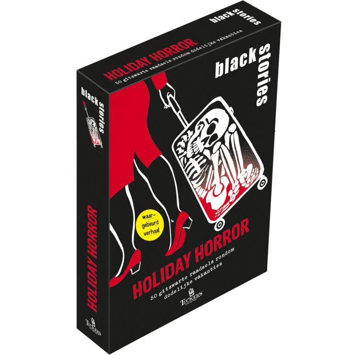 itzwarte raadsels en angstaanjagende vakantieverhalen… black stories: Holiday Horror brengt je sinistere mysteries waarin ontspanning omslaat in spanning. Deze verhalen spelen zich af op plekken waar niemand onheil verwacht, maar waar de kleinste fout kan leiden tot de grootste nachtmerrie. Lukt het jullie om de gruwelijke gebeurtenissen van deze noodlottige vakantiegangers te ontrafelen? Test je scherpzinnigheid, stel slimme vragen en ontdek wat er werkelijk is gebeurd. Extra spelvariant! Verdien speelfiches door het stellen van slimme vragen.